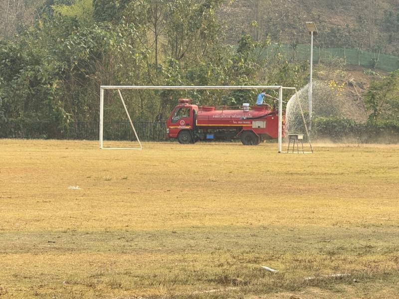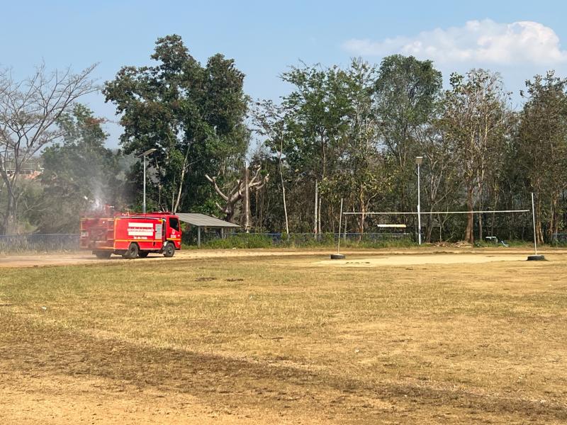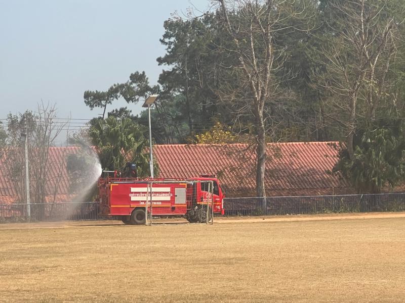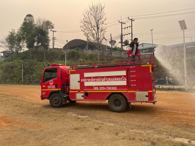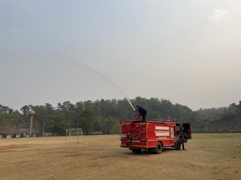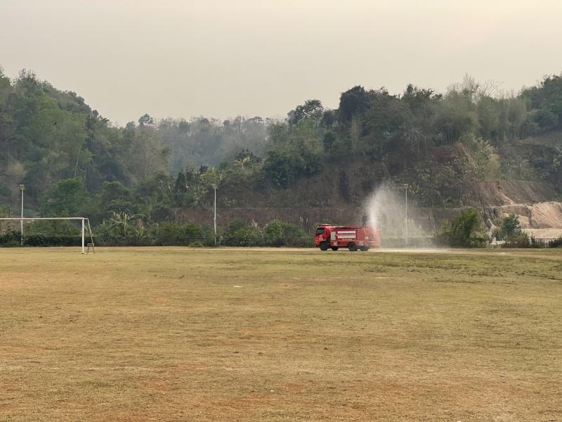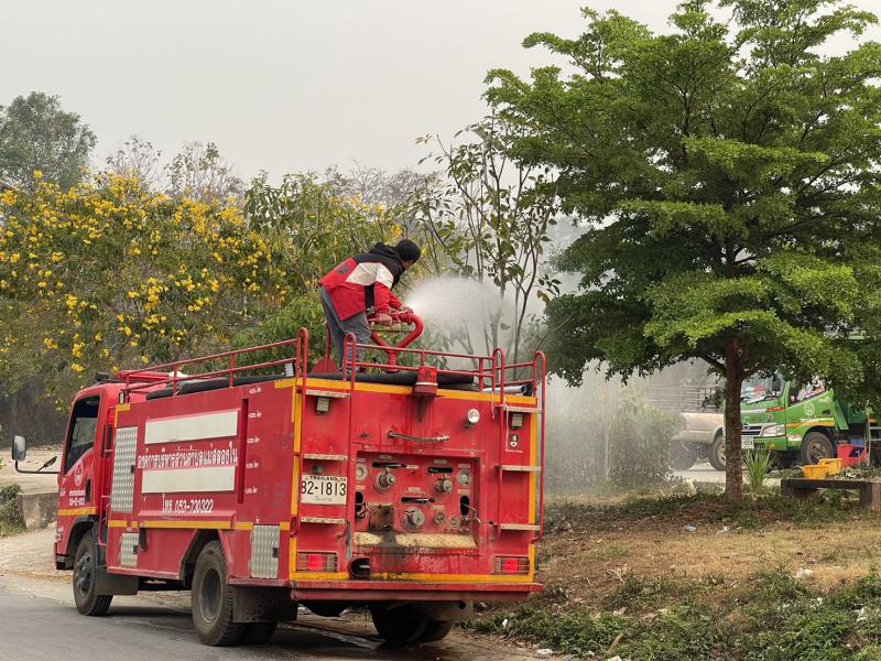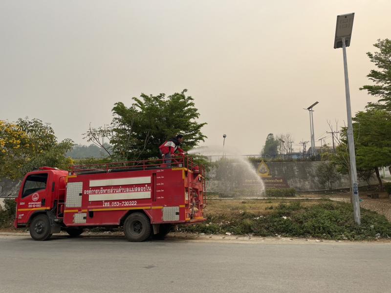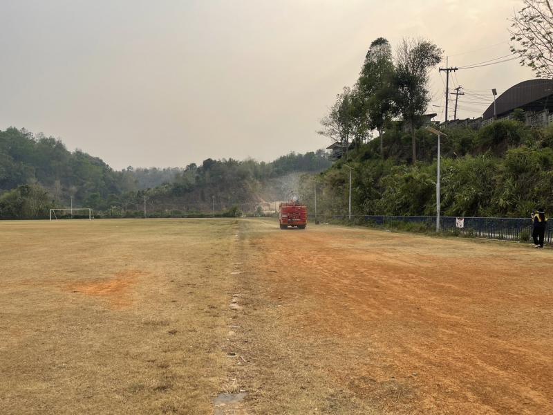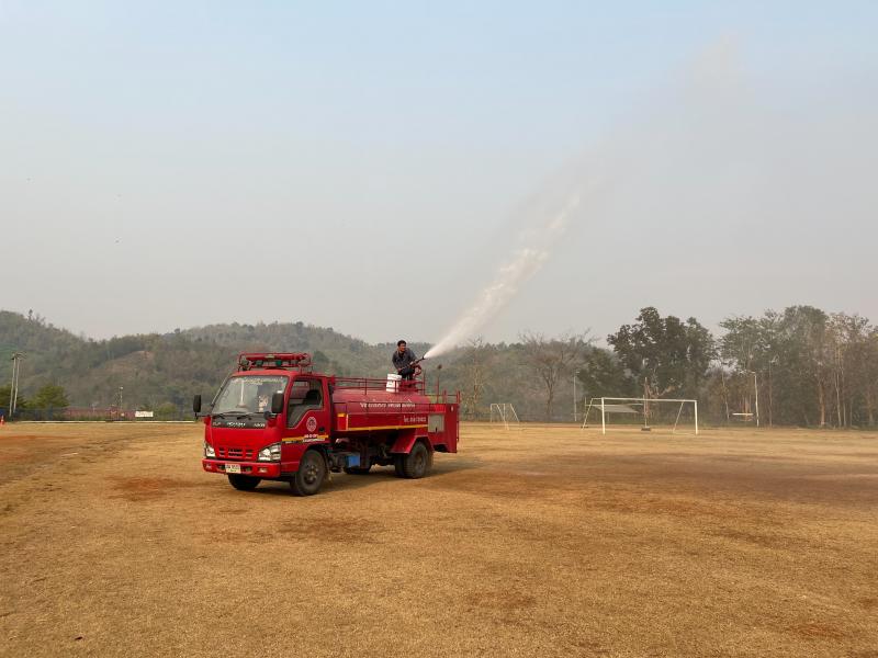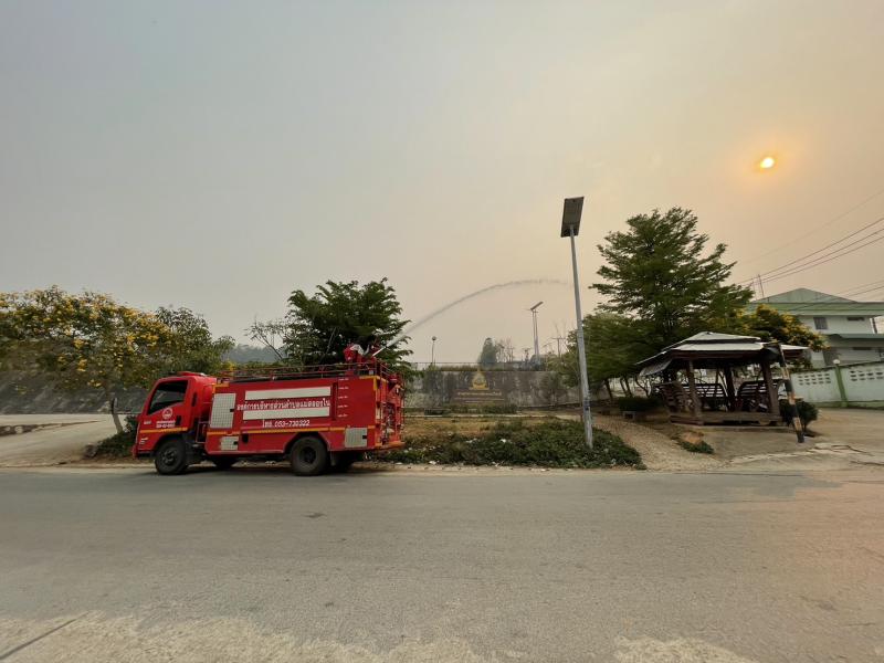 งานป้องกันฯ ออกปฏิบัติหน้าที่ รดน้ำที่สนามกีฬากลางตำบลแม่สลองใน และรดน้ำสวนหย่อมเฉลิมพระเกียรติ เพื่อลดฝุ่น pm 2.5 และหมอกควัน