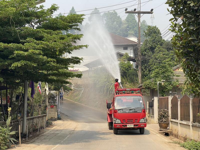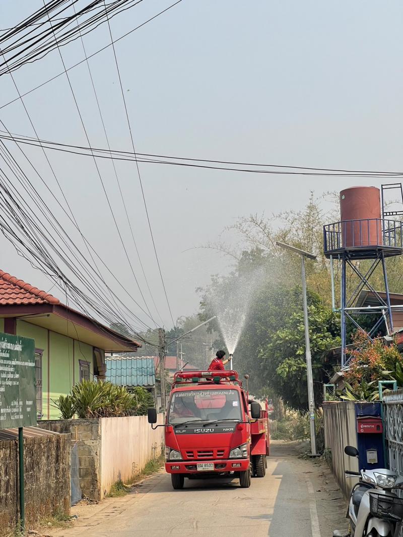 งานป้องกันฯ ดำเนินการพ่นละอองน้ำในอากาศ ปริมาณ 4,500 ลิตร เพื่อเพิ่มความชื้นในอากาศและลดฝุ่นละอองขนาดเล็ก PM 2.5 ในพื้นที่