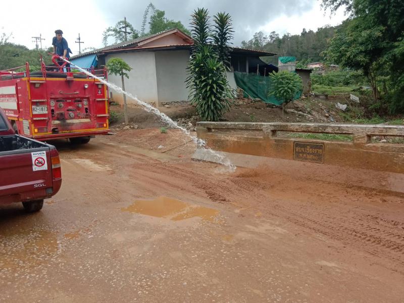 งานป้องกันฯ ออกบริการล้างเศษหิน ดิน และทราย บริเวณสะพานทางขึ้นบ้านมะหินกอง ตามคำขอความช่วยเหลือฯ